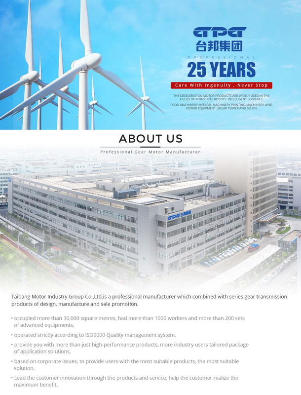 L'accumulation de 20 ans de précipitation a contribué au centre professionnel de Taibang. Actuellement, la société principalement développe et fabrique les réducteurs cylindrique spiraux de vitesse, réducteurs hypoïdes de vitesse, réducteurs d'engrenage à vis sans fin, réducteurs d'engrenage planétaire de précision, réducteurs de rv, réducteurs harmoniques et d'autres réducteurs adaptés aux besoins du client, etc. assortissant les moteurs servo, moteurs sans brosse de C.C, moteurs de C.C, moteurs de couple, moteurs à induction, moteurs réversibles, moteurs de contrôle de vitesse de frein et d'autres produits de transmission sont très utilisés dans diverses lignes de production industrielles, machines de transport, machines de textile, machines d'emballage alimentaire, automation, robots médicaux et intelligents, bras robotiques et d'autres champs de transmission.